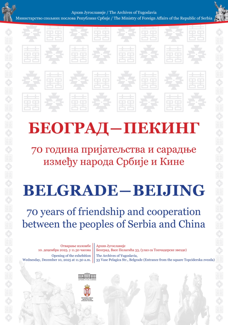 On Wednesday, December 10, 2025, at 11:30 AM, the exhibition "Belgrade – Beijing: 70 Years of Friendship and Cooperation Between the Peoples of Serbia and China" will be officially opened at the Archives of Yugoslavia. The organizers of the exhibition are the Archives of Yugoslavia and the Ministry of Foreign Affairs of the Republic of Serbia. The authors of the exhibition and the catalog are Dragan Teodosić, senior archivist, and Marko Davidović, archivist.