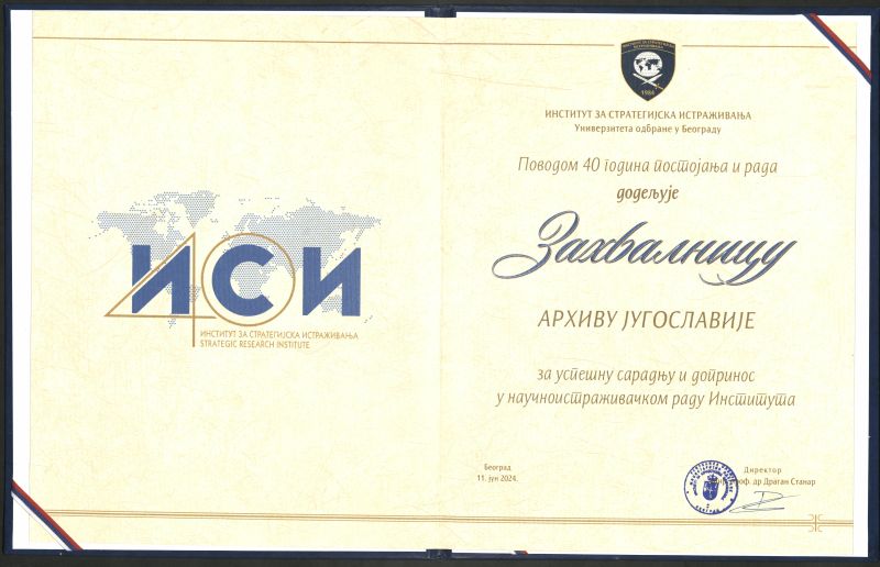 On Tuesday, June 11, 2024, a jubilee marking the 40th anniversary of the Institute for Strategic Research was ceremoniously celebrated at the "General Jovan Mišković" barracks in Belgrade. On this occasion, a certificate of appreciation was ceremoniously presented to Dr. Milan Terzić, the director of the Archives of Yugoslavia, for the successful cooperation and contribution to the scientific research of the Institute.