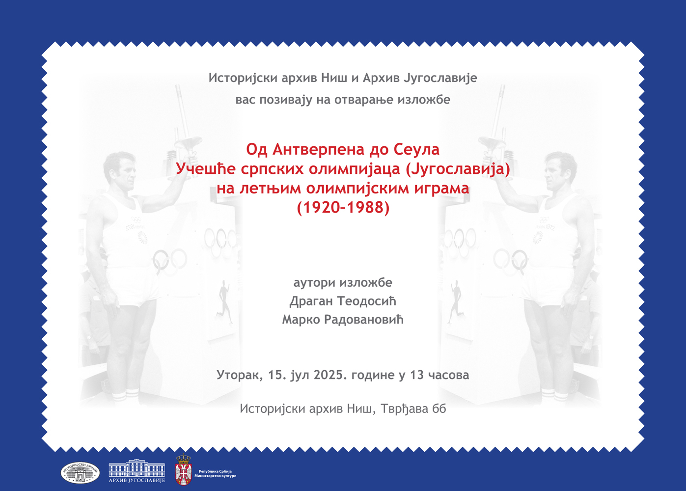 Обавештавамо вас да ће након Париза, Београда и Зрењанина изложба архивских докумената „Од Антверпена до Сеула. Учешће српских олимпијаца (Југославија) на летњим олимпијским играма (1920-1988)”, гостовати у Нишу, у Историјском архиву Ниш.
