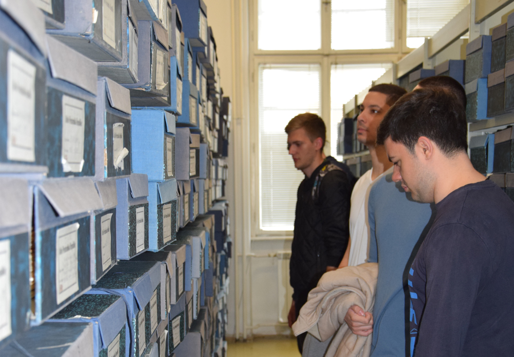 In front of the Archives of Yugoslavia, Dr. Milan Terzić, Director of the Archives of Yugoslavia, and Dragan Teodosić Senior Archivist, Head of the Department for Publication of Archival Material and Inter-Archival Cooperation welcomed the students and Professor Dimić. The students got acquainted with the history of the Archives of Yugoslavia, history of the building of the Archives and the archival material, archival fonds, the digitizing process as well as publishing and exhibition activities, after this introduction they started the practical part of their visit - working on archival material.