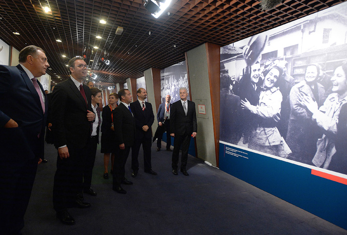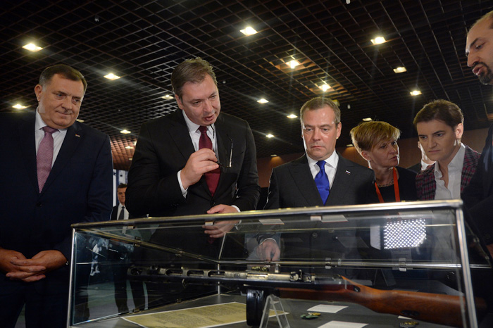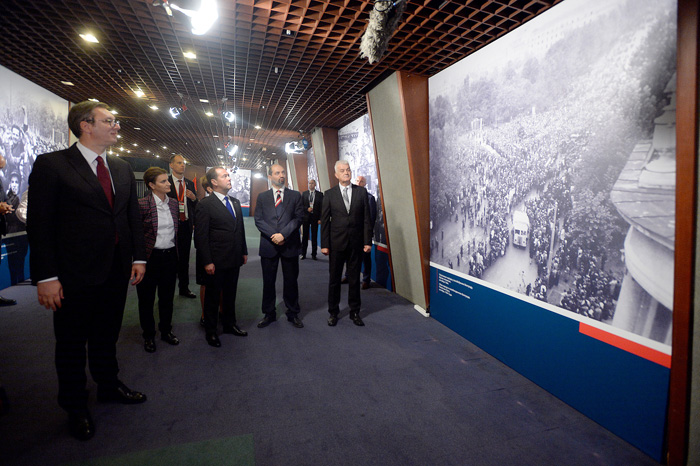 Председника Вучића, премијере Медведева и Брнабић, као и члана председништва БиХ Додика, поздравио је др Милан Терзић, директор Архива Југославије, а водич кроз изложбену поставку био је Петар Росић, виши архивиста Архива Србије.